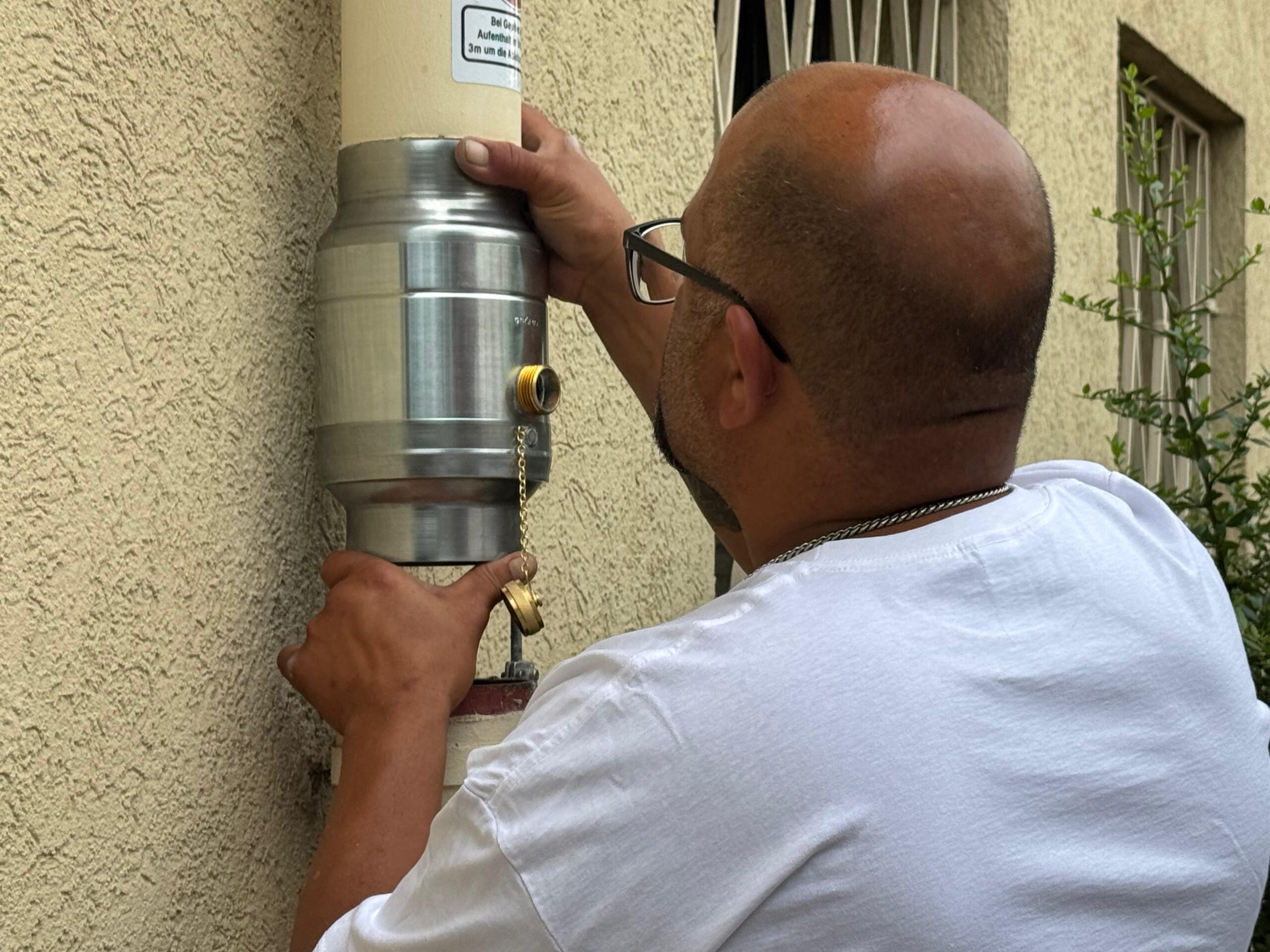 Schnell und unkompliziert wurde das Fallrohr mit einem Regensammler versehen, um demnächst einen Wassertank mit Regenwasser zu befüllen.